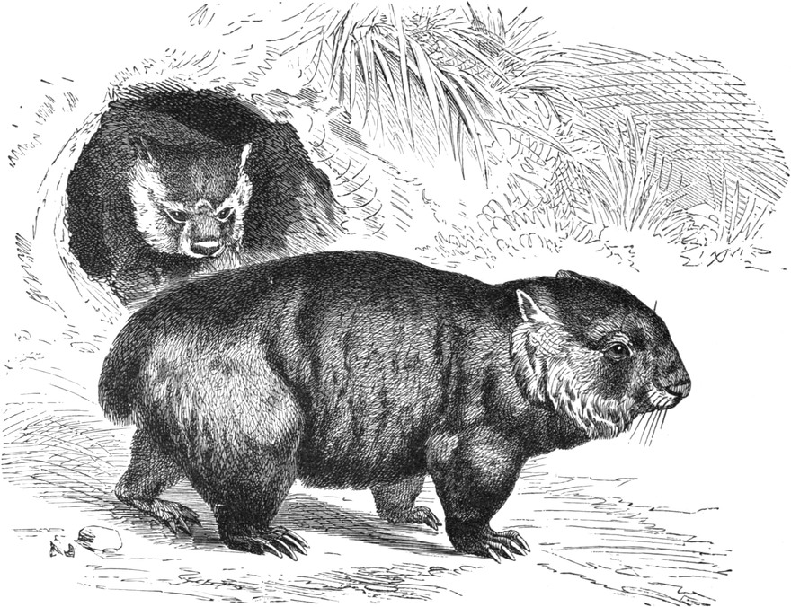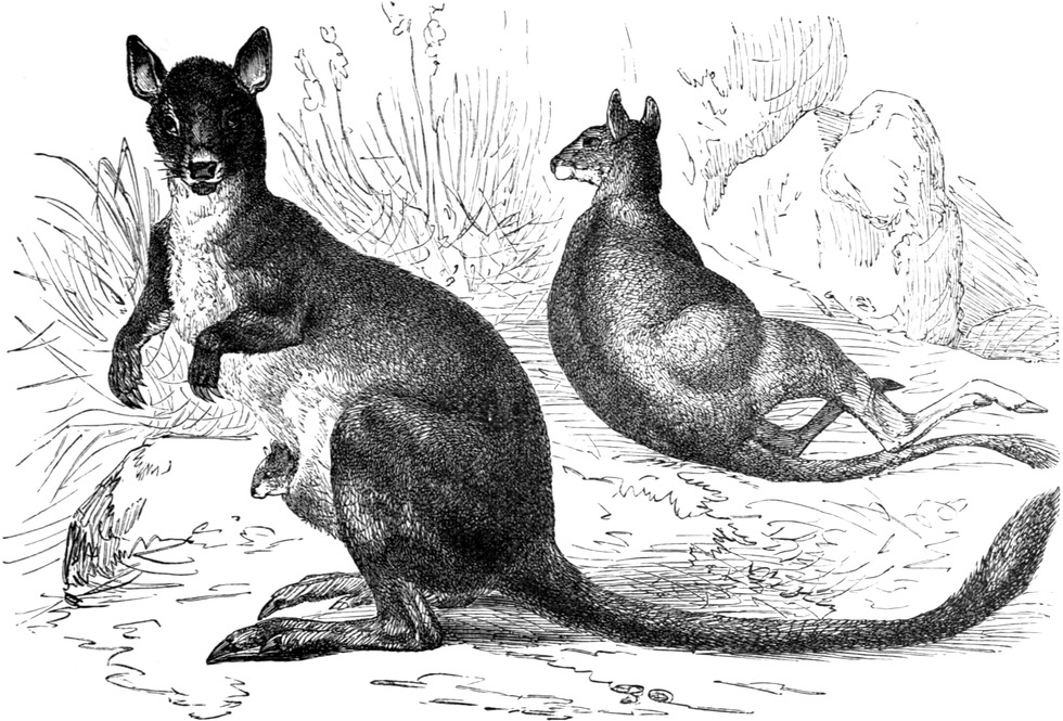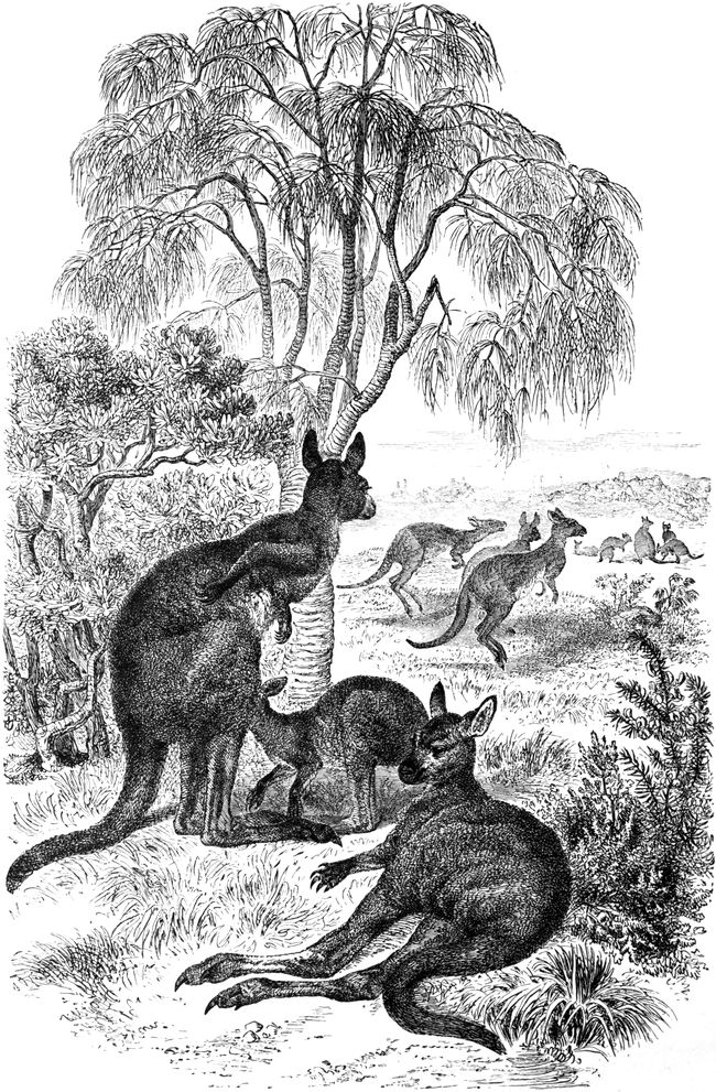 | THE GREAT KANGAROO—Captain Cook and the Great Kangaroo—Habitat—Appearance of the Animal—Marsupials separated from the other Mammalian Orders, and why (Footnote)—Gestation and Birth of Young (Footnote)—Mode of Running—The Short Fore Limbs—The Marsupium, or Pouch—Head—Dentition—Peculiarities in the Teeth—Hind Extremities—Foot—Great Claw—How the Erect Position is maintained—Whence their Jumping Power is derived—Other Skeletal Peculiarities—Kangaroo Hunts—Becoming Rarer—Mode of Attack and Defence—Hands—Bones of the Fore Limbs—Skull—Stomach—Circulation of Blood—Peculiarity in Young—Nervous System not fully developed—Brain—The Baby Kangaroo in the Pouch—THE HARE KANGAROO—THE GREAT ROCK KANGAROO—THE RED KANGAROO—THE BRUSH KANGAROO—THE BRUSH-TAILED ROCK KANGAROO—THE COMMON TREE KANGAROO—THE KANGAROO-RATS—Characteristics—THE RAT-TAILED HYPSIPRYMNUS—Description—THE WOMBAT FAMILY—THE WOMBAT—Peculiarities—Description—Habits—Teeth—Skeleton | |