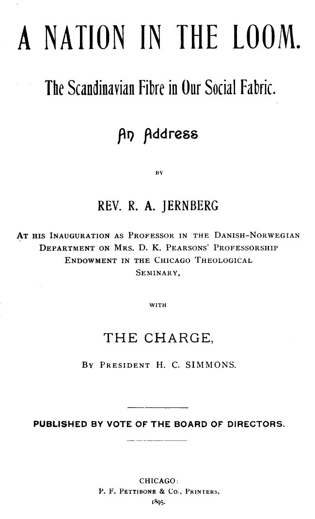 Our fathers coming over the sea left behind them in large measure the forms of church life of the old countries from which they came, but they kept their faith in God.[Pg 8] They shaped for themselves the forms of worship as they thought best adapted for the conditions of their new life. They drew them fresh from the Divine Word. They have built up for themselves and for us a church life and a national life, that have grown together into the life we now have. Shall we not expect that coming into our political and social life, these Scandinavian peoples will also readily assimilate our methods of religious worship and work? It is ours at least to place before them an open door and invite them into that liberty, that equality, that fraternity in Christian life and doctrine, which as a people it has been our privilege under God not only to proclaim, but I trust also in some degree to make real. May the blessing of God be with you in this work and upon the Seminary of which you now become an installed professor.