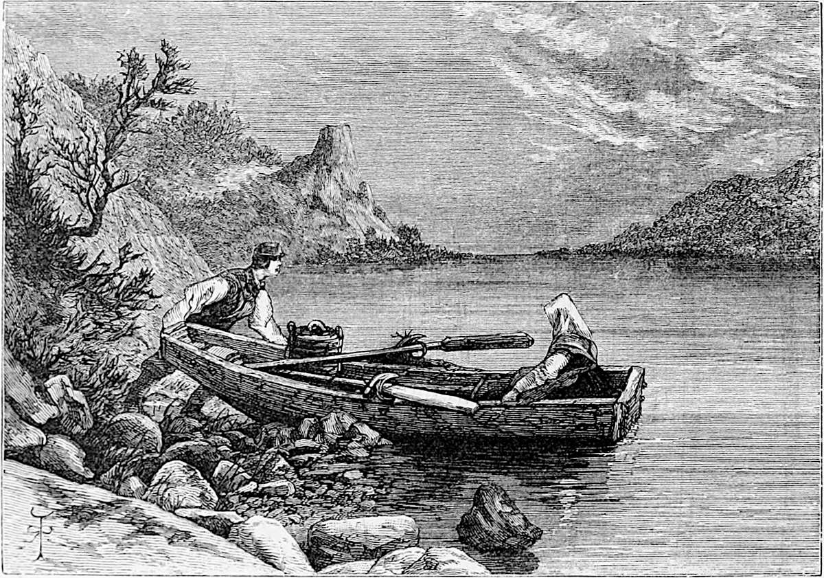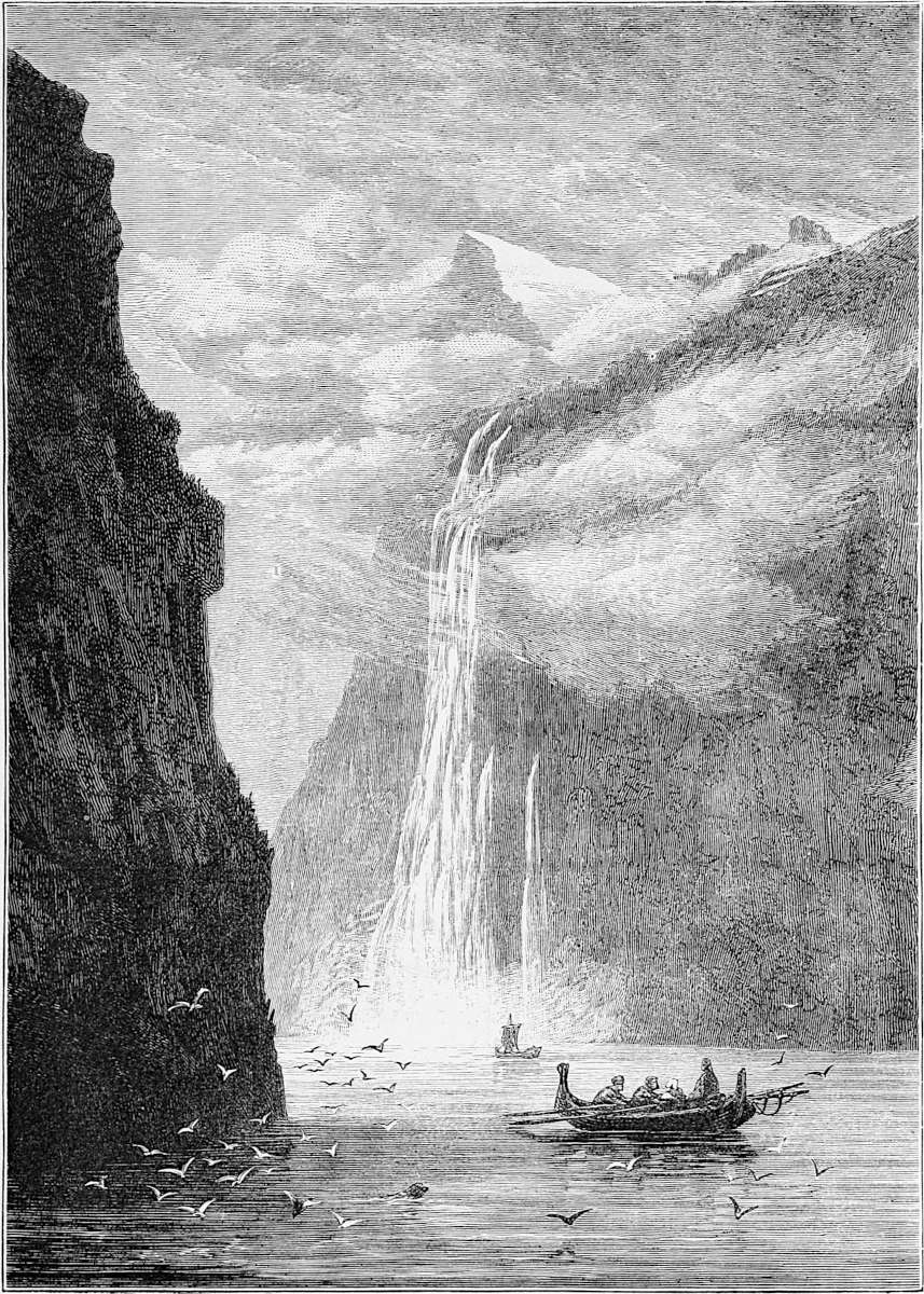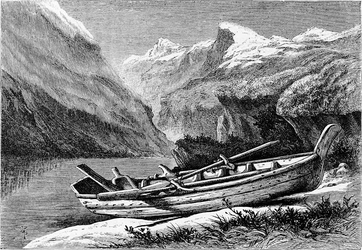 To visit Oscar’s Hall the most pleasant way is to take a boat and row across. This was suggested by Hans, and we were glad to find that he took kindly to boat work, as he came from Gudbransdalen, which is inland. More pleased, however, were we to discover, when about half-way across, that Hans was gradually bursting out into song, singing in a clear voice one of Kjerulf’s sweetest compositions, which we give in part at the end of the chapter. There is a plaintive sweetness throughout it, and the beauty of the evening, coupled with the surprise, caused us to anticipate 13many future repetitions, as nothing, when travelling, is more humanising and soothing than vocal or instrumental music.