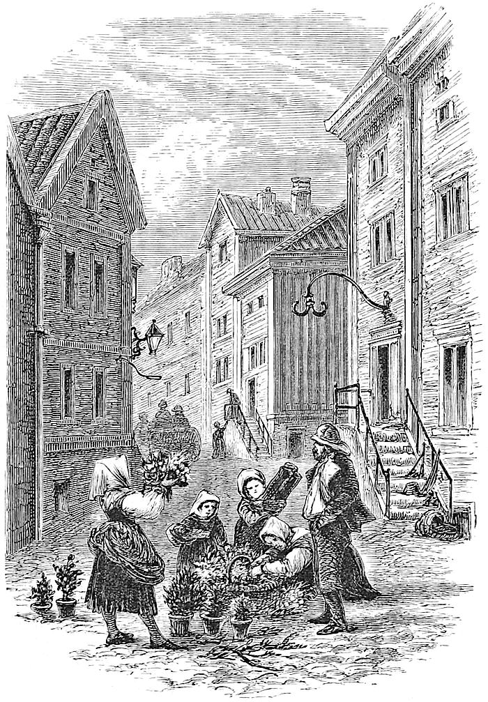 The first port touched en route for the capital of Norway is Christiansand, which is snugly hidden in the extreme south of the district of Sætersdalen—that land of eccentricity in costume and quaintness of habitation, of short waists and long trousers reaching to the shoulders, above which come the shallow, baby-looking jackets. With what zest does one strain for the first peep at a seaport of a foreign land! What value is attached to the earliest indication of varying costume, or even a new form of chimney! The steamer from Hull generally arrives at Christiansand on Sunday, when it is looking its neatest, the white tower of the church shining over the wooden houses of the town, the Norwegian shipping all in repose, with the exception, perhaps, of the heavy, compressed, Noah’s ark kind of dumpy barges, or a customs’ gig containing some official. As we looked up at the church tower we could8 not but wonder if we should hear, during our short visit, the whistle of the “Vægter;” for tradition says that, for the protection of the place, a watchman is always on the look-out, ready to give the alarm should a fire break out in the town, which, being built almost entirely of wood, would soon be reduced to a heap of ashes. But no; we heard no whistle, not even a rehearsal. On dit that for three hundred years has the Vægter looked out afar, and no alarum has issued from the tower. Christiansand has been mercifully preserved from fire, and long may it be so!