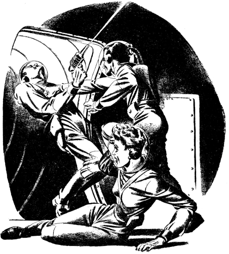 The airlock door swung open and three rough-looking men in space suits came cautiously through. They were followed by a dozen others not wearing the heavily-insulated space armor. The pirates must have run a gangway tube between the ships and fastened it with magnetic grapnels. The outer doors of the airlock would open automatically as the pressure equalized. He wondered if Gerda would have sense enough to close and bolt the outer as well as the inward doors. It was too late to worry about that now.