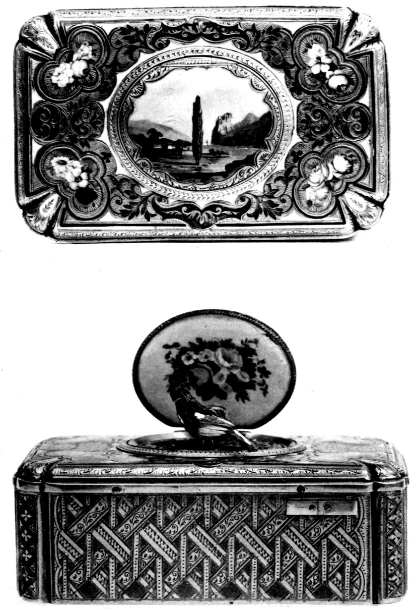 The characteristic of the antique singing bird snuff boxes, is that the bird, when singing and moving its wings, opens its beak, when turning the head. It is unfortunate to say, that modern watchmakers have not acquired the skilfulness of their predecessors, and that in modern boxes this triple movement can no more be obtained. This is, as a matter of fact, one of the first means of distinguishing an antique bird box, from a modern one.—