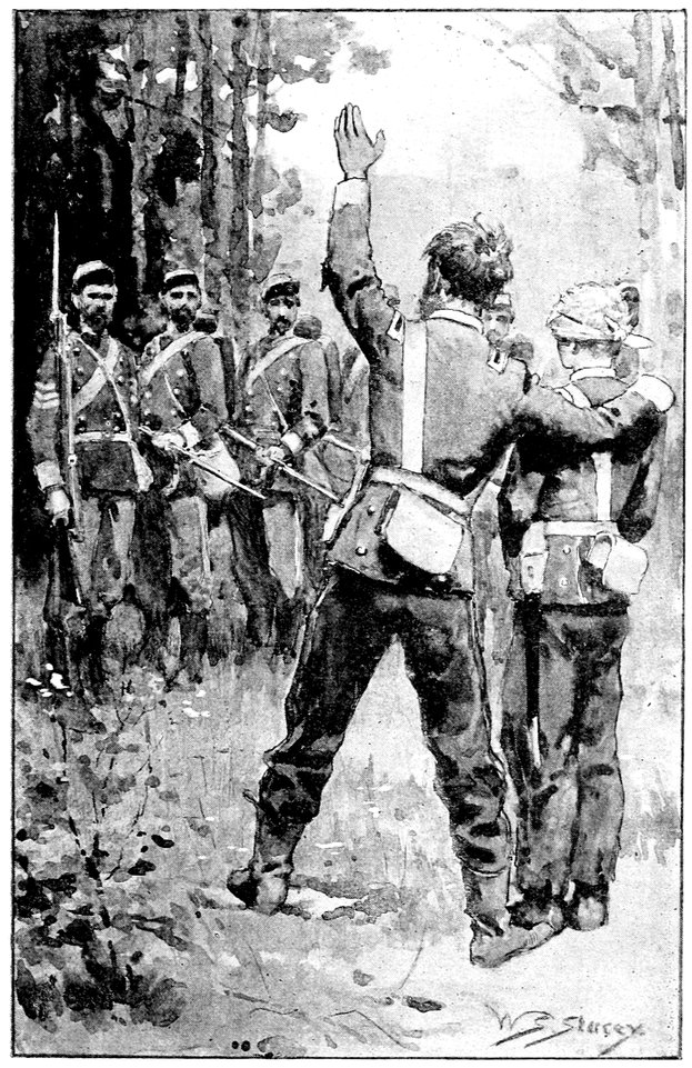 ‘Yes, sonny,’ answered Ephraim soothingly, as he glanced once more towards the woods. ‘Thar they air, the boys in gray,’ he murmured. ‘Why don’t they come out? Am I dreaming? It’s too late! too late! One of us must go under. I reckon it’ll hev ter be me.’ Then dashing the handkerchief to the ground beside him, he placed his right arm round Luce’s shoulders and roared at the top of his voice: ‘Fire, boys! Fire!’
