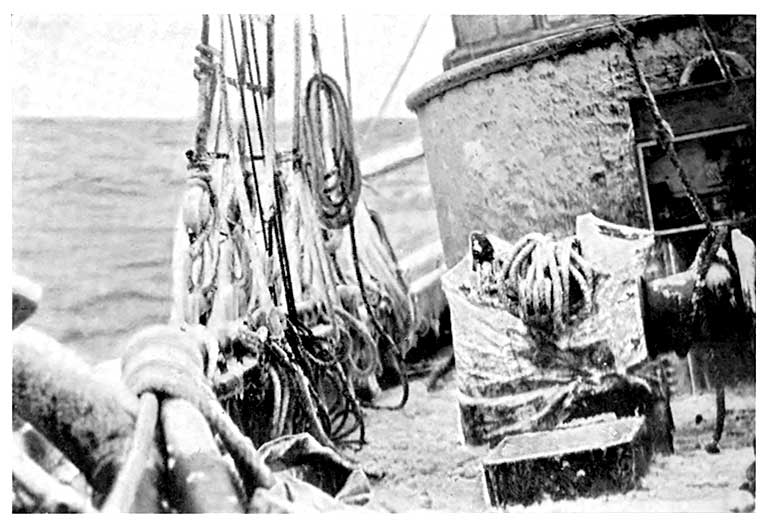 Next day we cleaned ship, and, with the wind dying down into puffs, encountered heavy rain, which gave us all the joy of baths. This being Sunday I took opportunity for a “sailor’s pleasure,” and turned out my bunk, which, from its peculiar situation just below the companion-hatch into the wardroom, seemed to be the harbouring-place of every oddment in the ship. The sum total of these accumulations is interesting. Listen: Sea-water, sea-boots, enamel plates and other eating gear, soup, salt pork and tinned fruit, and a sample of every article of food ever consumed aboard.