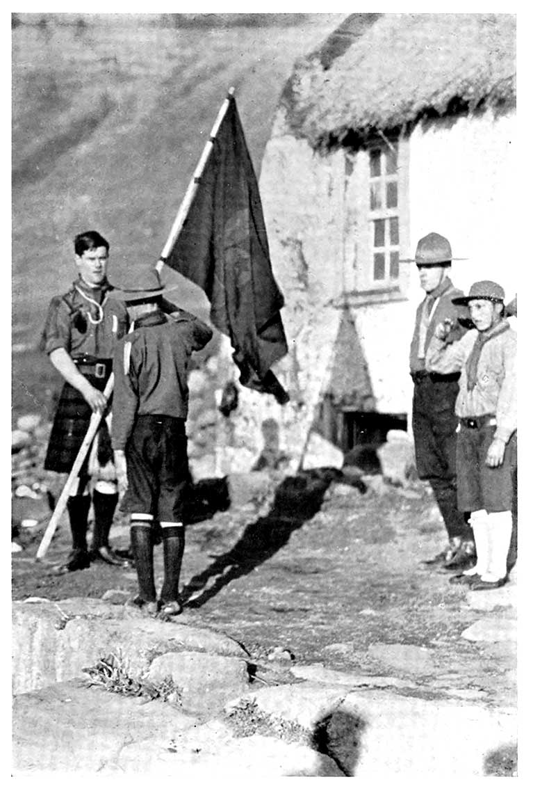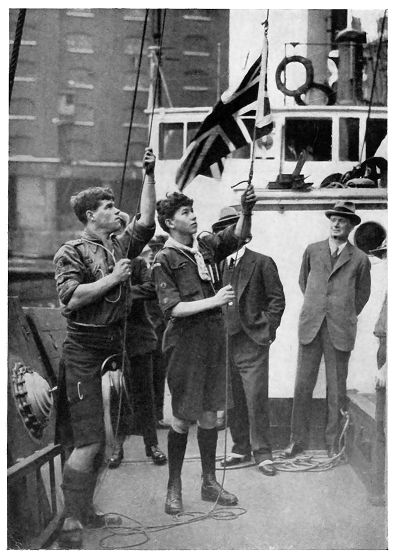 Raising the Union Jack given by King George V to the Quest (Scout Marr is hoisting the left Signal Halyard) | Frontispiece | |