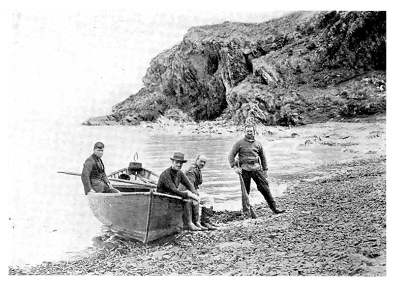 A landing party of Wilkins, Douglas and Carr, together with myself, left the ship in the surf-boat; we got ashore with difficulty at a spot where the rocks rose sheer from the sea; but there was a narrow ledge at a negotiable height which gave us a chance of a rough, wet scramble to terra firma and enabled us to land our scientific and lethal equipment after a more or less breathless struggle.
