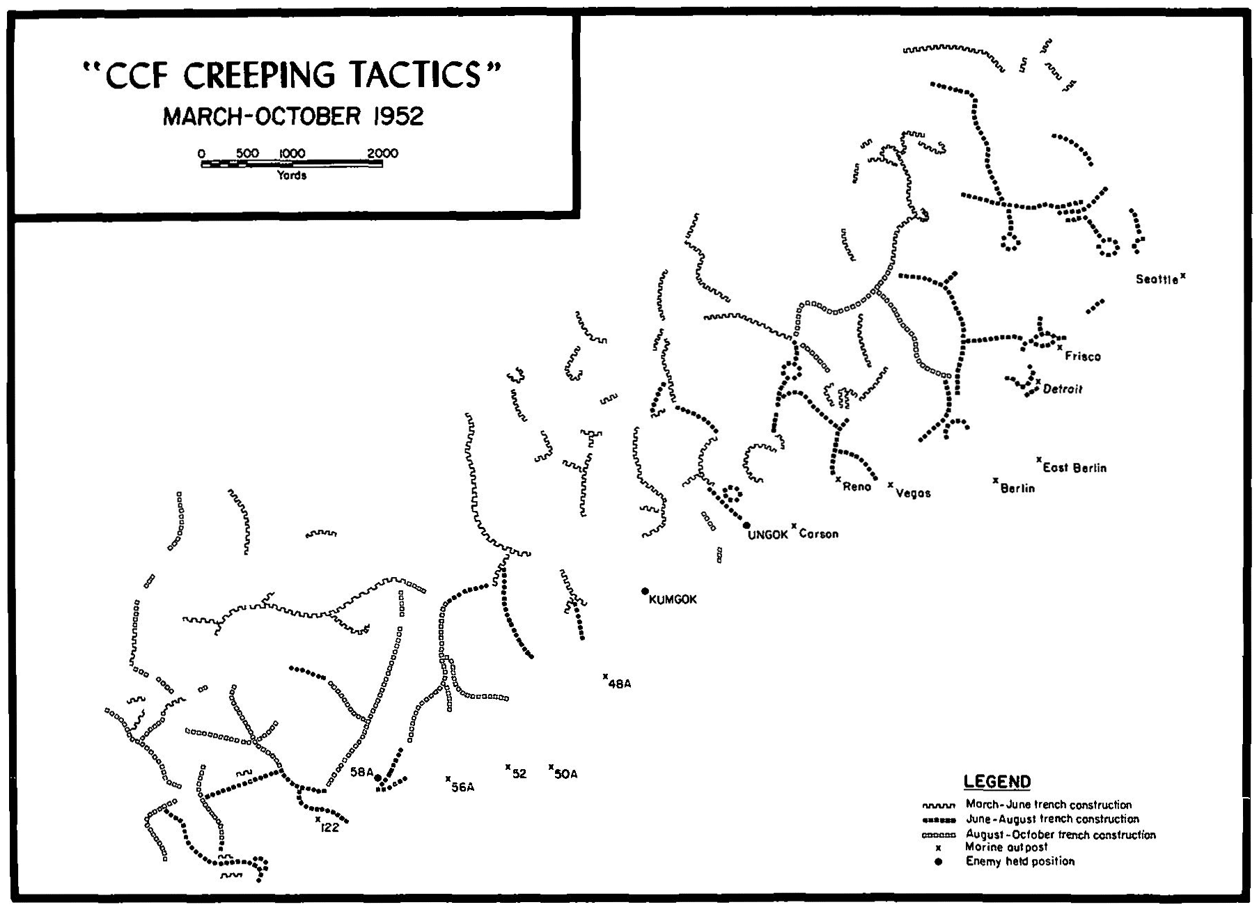 In March 1952 the 1st Marine Division redeployed from the East-Central front to West Korea. This new sector, nearly 35 miles in length, anchored the far western end of I Corps and was one of the most critical of the entire Eighth Army line. Here the Marines blocked the enemy’s goal of penetrating to Seoul, the South Korean capital. Northwest of the Marine Main Line of Resistance, less than five miles distant, lay Panmunjom, site of the sporadic truce negotiations.