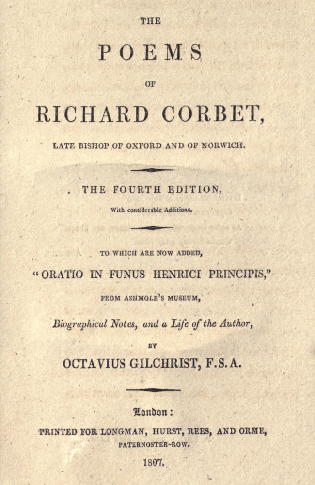 Richard Corbet, successively bishop of Oxford and Norwich, was born at the village of[vii] Ewell in Surrey, in the year 1582: he was the only son of Bennet, or Benedicta, and Vincent Corbet, who, from causes which I have not discovered, assumed the name of Poynter. His father, a man of some eminence for his skill in gardening, and who is celebrated by Ben Jonson in an elegy[1] alike[viii] honourable to the subject, the poet, and the friend, for his many amiable virtues, resided[ix] at Whitton, a hamlet in the parish of Twickenham, where the poet passed his declining days. Under the will of his father[2] he inherited sundry freehold lands and tenements lying in St. Augustine’s parish, Watling-street, London, and five hundred pounds in money, which was directed to be paid him by Bennet, the father’s wife and sole executrix, upon his attaining the age of twenty-five years. After receiving the rudiments of education at Westminster School, he entered in Lent term 1597-8 at Broadgate Hall, and the year following was admitted a student of Christ-Church College, Oxford. In 1605 he proceeded Master of Arts, and became celebrated as a wit and a poet.
