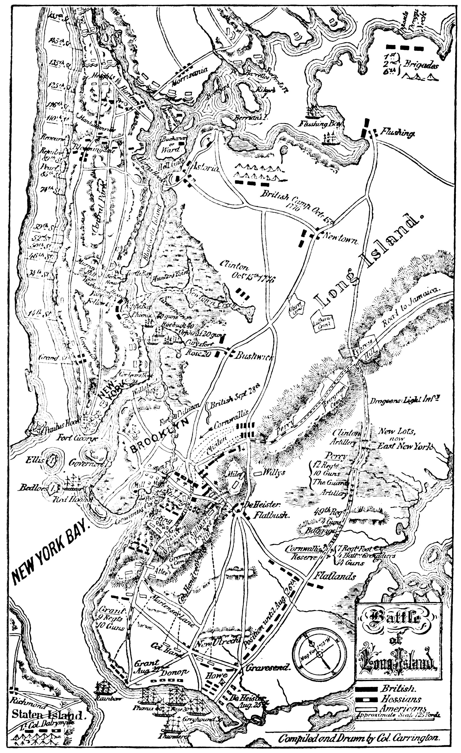 The maps, which illustrate only the immediate campaigns of Washington, or related territory which required his supervision, are reduced from those used in “Battle Maps and Charts of the American Revolution.” The map entitled “Operations near New York,” was the first one drafted, at Tarrytown, New York. In 1847, it was approved by Washington Irving, then completing his Life of Washington, and his judgment determined the plan of the future work. All of the maps, however, before engravure, had the minute examination and approval of Benson J. Lossing. The present volume owes its preparation to the personal request of the late Robert C. Winthrop, of Massachusetts, made shortly before his decease, and is completed, with ever-present appreciation of his aid and his friendship.