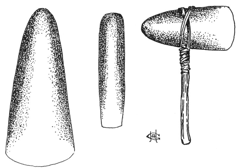 These, with the Grooved Axe illustrated on the following page, were the commoner types of implements used for chiseling and chopping. They could also be used as wedges. With the Celt, when used as a Chisel or Hand-hatchet, the human arm was the handle. If it served as a Hatchet, Tomahawk, or Axe, it was lashed to a wooden handle by means of rawhide thongs.