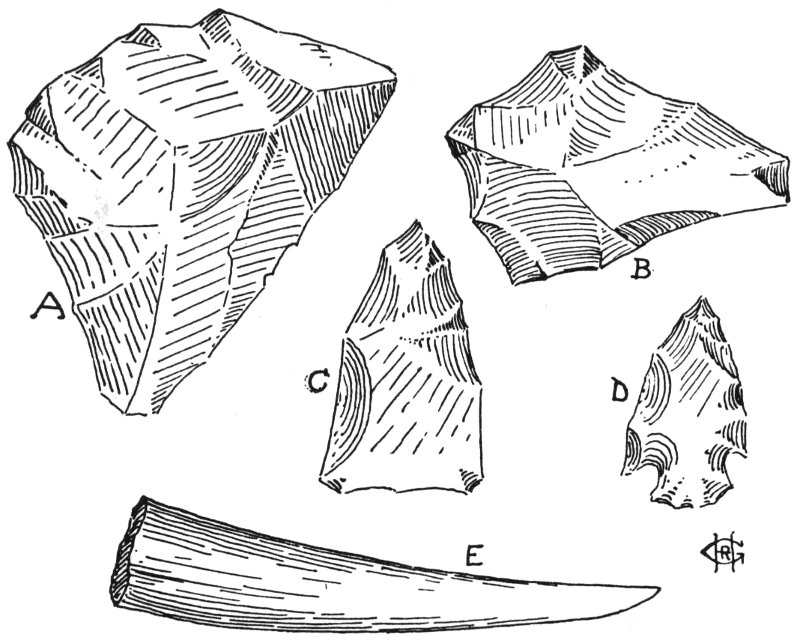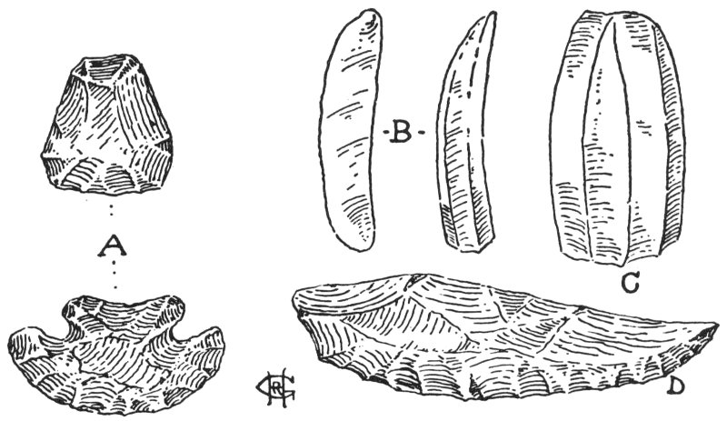 Scrapers of various sorts were made from flint, and served many purposes. The simplest form, a mere flake of flint, is the top specimen in “A,” while an improved type, with notches for securing it to a handle is shown below it. They were used for scraping wood, bone and stone, in making tools and ornaments, and for removing the fat from skins, before tanning.