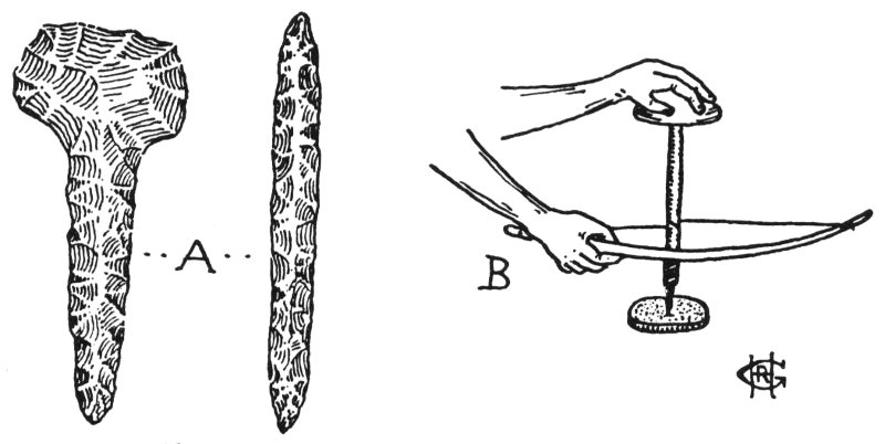 In “B” is shown the manner in which Flint points of this type were mounted on a shaft and made into a mechanical drill by twining a bow-string once around the shaft and drawing the bow back and forth.