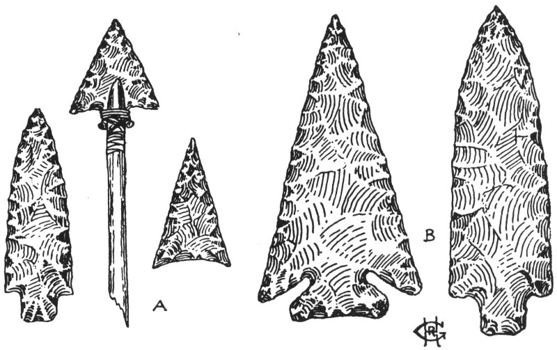 Most useful of all Flint implements were the “Points” or “Heads” of Flint, as shown above. The only difference between an Arrowhead (A) and a Spearhead (B) is that of size. Those more than three inches long are usually called Spearheads.