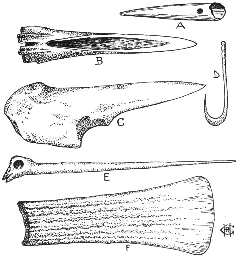 Next to Stone and Flint, the Mound-builders prized Bone for making implements and ornaments. Above (B, C) are shown two Bone Awls, which served for piercing leather and bark, and also as “tableware” in eating their meals. Other things made from bone were Harpoons and Arrowheads (A), Fish Hooks (D), Scrapers (F), Hoes, Needles (E), and Ornaments such as Beads and Pendants.
