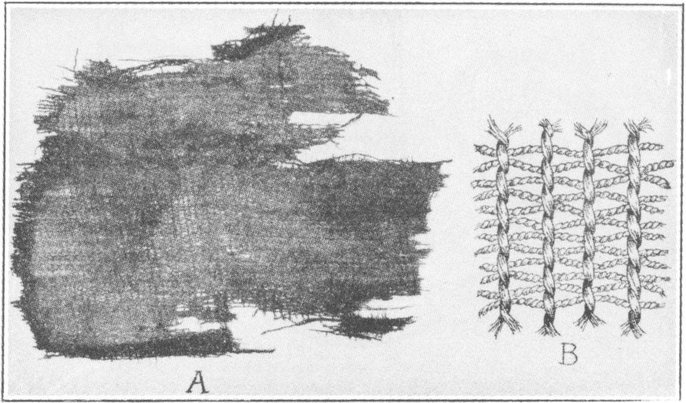The Mound-builders wove serviceable cloth from the tough fibers of plants and the inner bark of certain trees. The sample shown as “A” resembles the homespun linen of the days of our pioneer grandmothers, and in “B” a piece of the same sample is magnified to show the weave. Cloth, as well as the skins of animals, was used for clothing by the Mound-builders, and they probably knew how to weave thick blankets to protect them from the cold in winter. There are many samples of Mound-builder Cloth, as well as of woven bark matting, in the Ohio State Museum. These show half a dozen or more different weaving patterns, of which the weave shown in the above picture is but one. Copper implements found in the mounds were very often wrapped in Cloth, which was preserved throughout the centuries by the chemical action of the Copper.