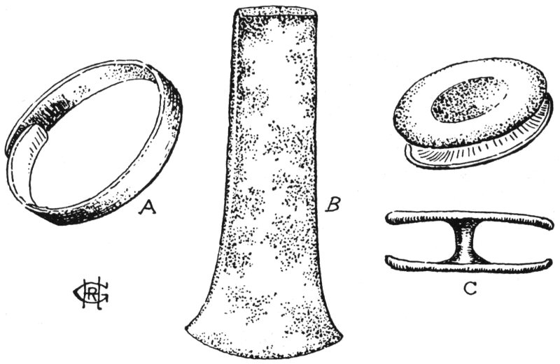 Although strictly a Stone Age people, the Mound-builders used Copper, Silver and other native metals. They had not learned to melt these, but pounded the metal into the desired shape, afterward polishing the objects by rubbing. The objects shown in the picture are all made of Copper. “A” is a Bracelet and “B” is a Celt, or ungrooved Axe. “C” shows two views of what are called Ear-spools. These were worn as ornaments in the ears, and probably signified some particular station in life. The Mound-builders obtained their copper from the shores of Lake Superior, where it is found near the surface of the ground. Many of the pits they dug there are still to be seen. Silver was also obtained by them in the same region.