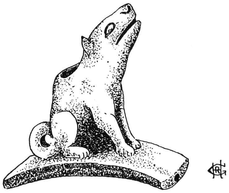 The Mound-builders cultivated and smoked Tobacco long before civilized people knew of the plant. Above is a picture of one of their Tobacco Pipes, in which they have shown their artistic ability by carving it in the image of the Dog, their only domestic animal. Several hundred pipes like this one have been found in mounds in Ohio, representing many different animals and birds, and the human form has also been found. The American Indian not only taught the white man the use of tobacco, but it was probably from pipes very much like those of the Mound-builders, with stem and bowl, from which our modern tobacco-pipes are copied.
