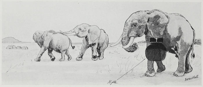 I often had the opportunity of testing this extraordinary little weapon on other animals than elephant. Once, to relate one of the less bloody of its killings, I met at close range, in high grass, three bull buffalo. Having at the moment a large native following more or less on the verge of starvation, as the country was rather gameless, I had no hesitation about getting all three. One stood with head up about 10 yds. away and facing me, while the others appeared as rustles in the grass behind him. Instantly ready as I always was, carrying my own rifle, I placed a ·276 solid in his chest. He fell away in a forward lurch, disclosing another immediately behind him and in a similar posture. He also received a ·276, falling on his nose and knees. The third now became visible through the commotion, affording a chance at his neck as he barged across my front. A bullet between neck and shoulder laid him flat. All three died without further trouble, and the whole affair lasted perhaps four or five seconds.