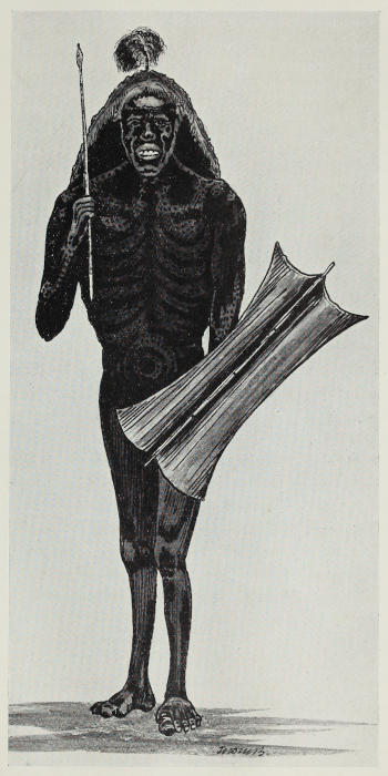 I well remember the mixed awe and apprehension with which I approached a herd of buffalo in my early hunting efforts. I had read of all the hair-breadth escapes hunters usually had with these animals,[171] of their diabolical cunning, etc., and I was quite determined not to wound any. I was also very cautious not to approach too near. There were many of them out in fairly short grass. I could see them all clearly, and as we wanted meat I thought I would select a nice fat cow. With me were about forty young bloods from the tribe with which I was hunting. They were all fully armed in their fashion—each man carried two thrusting spears and a rhino or giraffe hide shield. The reason they carried shields was that we had been hunting elephant in no man’s land, where prowlers from the enemy, i.e., the neighbouring tribe, might have been met. Telling this mob to get away back while I did the shooting I left them and approached the browsing and unsuspicious herd. Selecting what I thought would be a fat one, I fired. Without pausing or wavering the whole herd started straight for me, closing together as they came. I fired again at one of the leaders and then started to get out of their way. As I ran to the side I met and ran through the forty spear-men, who were now rushing straight to meet the herd. Stopping and turning, I was astounded to see these fellows right in among the buffalo, some retreating cleverly backwards and receiving the charging animals’ rushes on their shields, while others jabbed spears into their vitals from the sides. No sooner was an animal down than off they went after the retreating herd. And here, again, all my preconceived notions were upset, for the natives caught up with the buffalo again and killed several more. But for the herd’s arrival at a belt of forest, perhaps they would all have been speared. Not a native was touched. I must say I was rather staggered by what had taken place; the awe-inspiring charge was apparently a simple running away; the terrific speed, strength and agility of the story-book buffalo all shown up by a handful of nimble lads armed with soft iron spears; the formidable buffalo made to cut a very poor figure, and the white man with his wonderful gun made to look extremely foolish.