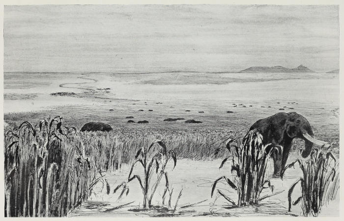 So far we had not met with great numbers of tsetse. But now we began to reach a very flat country which was evidently all under water in the wet season. Half submerged evergreen forests became more and more common. These cool, damp forests were full of tsetse, and in a few days we were overjoyed to find that elephant frequented them in goodly numbers. Buffalo also seemed fond of them. Had it not been for the swarms of tsetse I think we would have found these groves of evergreen standing full of elephant and buffalo. As it was they came to them only by night, withdrawing to the open bush and dry grass lands in the daytime. Only once did we actually see elephant from the canoes in the daytime, although we frequently did so by night.