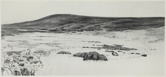 About fifteen miles back from their drinking place there were signs of the elephant having left their huge and well-worn trails, scattering right and left into small groups, the better to find their scanty food. We saw plenty of fresh rhino spoor, but this was one of the few days upon which we did not encounter them in the flesh.