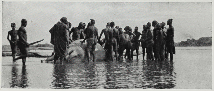 When all were aboard we paddled slowly across to the natives, who were obviously shy. Anchoring the canoe by clinging to the grass, we held a kind of introduction ceremony. Among the natives we were glad to see our friend of yesterday’s hippo-spear incident. We laid bare to them our object in ascending this river, and asked in return with whom we had to deal. They said that they came from the south, to reach their village requiring four days’ travelling without loads. Knowing the kind of thing they meant by this, I estimated the distance at about 180 or 200 miles. They disclosed also that they had originally been under Senussi at Ndélé, that they still paid taxes and found labour for that post, but that since the occupation of the country by the French, following upon the killing of the old Sultan Senussi, they now lived three or four days’ march to the north of the post Ndélé. While Senussi reigned they had been obliged to live in the capital; as with Buba Gida, all the inhabitants of the country for 300 miles round had been “gathered in.” Meanwhile, they said, elephant were now in the neighbourhood and that they could show us them. We were ready in a very few moments to accompany them, merely taking a mosquito net, a small packet of tea and sugar and a kettle. Presently we joined up with some more natives, some of whom were armed with the enormous elephant spear of the Arab elephant hunters, whose country lay to the north. These spears have a leaf-shaped head from 7 ins. to 9 ins. across, and are kept razor-edged. The system of hunting is this. In the dry season, when most of the grass has been burnt off and the harmatan is blowing, all the young bloods arrange an expedition. The harmatan is the north-east monsoon of the Indian Ocean, and is a hard breeze at midday of a velocity of about 30 m.p.h., dry and hot when it comes off the desert, and constant as regards direction. At this season so dry is the air that sound carries no distance, and one may walk up to within a few feet of elephant without fear of discovery. These expeditions sometimes number[166] 300 spears. All the old crocks of horses are raked up. The rich are represented on the expedition by slaves, mostly on foot. All are armed with the huge spears, with their bamboo shanks 10 ft. or 12 ft. long. Off they set for the south, poorly supplied with food, as they reckon to live “tough” on what they can kill. When they set out they and the horses are in very good condition, but when they return the men are haggard and thin, leg-weary and footsore, while most of the horses are bleached and well gnawed skeletons in the bush. Few survive the hard work, poor food, and constant attacks of the tsetse fly. When they meet with the fairly recent trail of a herd of elephant they take it up with tremendous vigour, push along it without a stop until dark, camp, on again next day without a stop, perhaps camp again and eventually sight their quarry. Then those on horses dismount, the protectors are taken off the razor-sharp spear-heads, and all advance shoulder to shoulder, spears held projecting 6 ft. or 7 ft. in front, the flat of the spear-head lying in a horizontal direction. With the harmatan blowing its hardest it is possible for the line of spear-men to come within thrusting distance of the elephants’ sterns, and at a signal the spears are driven in with the aim of cutting the large tendons and arteries. Hence the width of spear-head. In the consequent commotion casualties among the spear-men are frequent, as might be expected. Off go the unwounded animals, the horses are brought, and the chase is again taken up. Now the elephant will not stop for miles and miles, so they must be ridden to a standstill, or nearly so, before another assault on them can be attempted. Away into desperately dry and waterless country they go, but, try as they may, those human devils are always with them. The hardships these latter bear are almost incredible. They seldom have water or food with them. Often they are starving, and their only hope, the death of an elephant. Kill, or die miserably in the bush, is not a bad system and, as might be expected, leads to perfectly awful destruction of elephant life. Ivory is primarily the object, but, as the hunt develops, water and meat become of more importance. Water, I must explain, is obtained from the elephants’[167] intestines and, although warm, is quite good to drink. In the average herd cows and calves predominate, consequently they suffer most. In the case of this country the coming of the white man is the indirect cause of the destruction of elephant, and not, as in other parts of Africa, the direct cause of their protection. Natives are permitted to hunt elephant in the above manner on payment of a small fee, in order that they may acquire the wherewithal to pay their taxes—a policy short-sighted indeed, when we remember Darwin’s calculation that in 900 years two elephants become a million.
