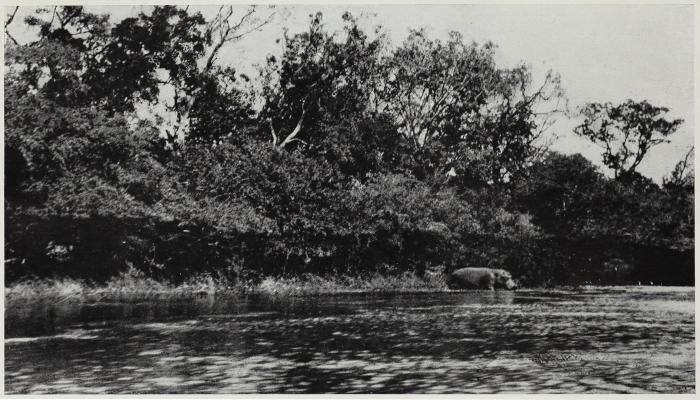 When all was ready we pushed off, very deeply laden. All was now new river ahead of us. As we progressed day by day hippo became more and more numerous. In some places they formed almost a complete barrage across the river. Sometimes it was ticklish work steering between them. Their heads often came up quite close to the canoes, and then they stared at us goggle-eyed with astonishment. Once W.’s canoe ran its stem on to the neck of a rising hippo, the fore part being lifted clean out of the water, canting over dangerously, and then let down with a whack as the old hippo dived. They shipped a deal of water, but there was no damage done. We soon found that if we kept on the shallow side of the pools we ran less chance of bumping into them, our only danger then being from hippo asleep on the bank suddenly waking up and rushing blindly towards deep water. Had we ever had the ill luck to have been across their way, I believe they would have rushed clean into or over us.