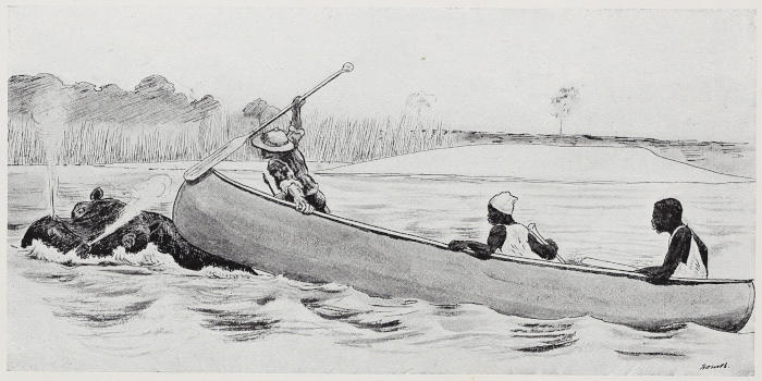 W., IN THE SMALL CANOE, RUNS INTO A RISING HIPPO BUT DIGS HER IN THE NECK WITH HIS PADDLE AND SHE DISAPPEARS WITH A SPLASH, NEARLY SWAMPING THE CANOE.