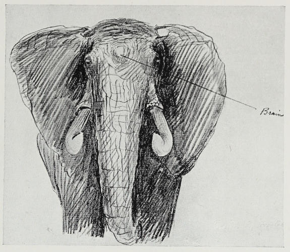 Speaking personally, my greatest successes have been obtained with the 7 mm. Rigby-Mauser or ·276, with the old round-nosed solid, weighing, I believe, 200 grs. It seemed to show a remarkable aptitude for finding the brain of an elephant. This holding of a true course I think is due to the moderate velocity, 2,300 ft., and to the fact that the proportion of diameter to length of bullet seems to be the ideal combination. For when you come below ·276 to ·256 or 6·5 mm., I found a bending of the bullet took place when fired into heavy bones.