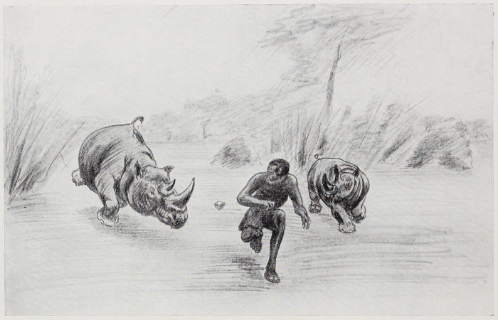 As our hunting operations were all rather similar to the above, except in result, I will pass them over and merely remark on the extraordinary numbers of rhino we met. They were so stupid and so numerous as to be a perfect nuisance. On sighting one we generally tried to avoid him by making a detour, but even then they would sometimes follow us. On several occasions our boys got into trouble with them and they had to be shot in order to avoid accidents. Once, on leaving camp for a few days’ tour in the bush, we started a big cow and a bull from the river bush. They trotted away and I thought no more about them. About an hour afterwards I heard a frantic shout behind me. I looked round, and there was my boy legging it straight towards me, with our two friends of the morning close behind him. The big cow was leading and was quite close to the boy. They were all going their hardest, and really appeared bent on mischief, so I was compelled to shoot the cow and, shortly afterwards, the bull also, as he went barging stupidly about. I sent afterwards for the horns of these rhino when I thought they would be sufficiently rotten to disengage easily. The boy who went for them found the bodies in the possession of three lions, which refused to budge when shouted at. We had provided the boy with a rifle. He said that he fired it at the lions, who took no notice of it, but continued to growl at him. He then had another shot, which hit one of them. They all withdrew a little distance, when the boy had another shot at the wounded one and killed him. He said that the others remained about in the vicinity while he skinned the lion and pulled off the horns of the now putrid rhino.
