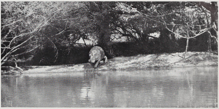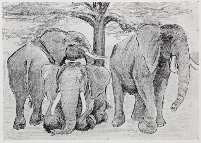 Fly and game became more and more plentiful as we journeyed on. When I speak of fly I mean tsetse; there were other flies in plenty, but they appeared of no importance beside the fiendish tsetse. We began to see buffalo now, and one day we saw where the river bank had been trampled down. As we approached it became clear that a very large herd of elephants had been there. It was soon evident that the tracks were quite recent, having been made the night before. We found a nice site for camp on an island, where our fires would not be seen by elephant revisiting their drinking place. We hoped that they would come in the night, and sure enough they did so, soon after sundown—such a splashing and rumbling, trumpeting and crashing. Lions were also busy, roaring on both sides of the river. It was a busy spot and one of our happiest camps. From it as base we hunted in all directions. And what a long way the elephant used to go in the daytime from the river. They would come to the river just after sundown when the flies were quiet. There they would spend the night, crashing the evergreen gallery-forest, plastering themselves with mud as a protection against fly on the following day, eating acres of the still green river grass, and generally enjoying themselves. It must be remembered that at this season everything a few yards back from the river is burnt up either by sun or fire. The dry season in these tropical parts is the winter of the Northern Hemisphere, in its effects upon vegetation. Instead of dying off the grass is burnt off. The grass fires wither the leaves on the trees and they fall immediately after. All temporary water, such as pools, puddles, etc., dries up. Fly desert the dry parts and congregate in myriads in the shade of the river forest. But they will[160] follow man or beast for miles into the dry country. It is astounding to look behind one as one leaves the vicinity of the river. Behind each man there is a small cloud of tsetse; they keep about two or three feet from the ground. Each traveller keeps flicking away fly that settle on the man in front of him. It is rather startling at first to receive a hard slap on the back when one is not expecting it. Fly generally got us under the brims of our hats and, when near to buffalo, one would be bitten every thirty seconds. Lucky for us that there were no natives about with sleeping sickness. During the dry season there is not much for elephant to eat away from the river. They pick up a fair lot of tamarind fruit, dig up roots, and chew aloes and sansivera fibre, spitting out the fibre in balls. But it is on the river that they depend for the bulk of their green food and water, and, were it not for fly, they would doubtless remain there day and night.