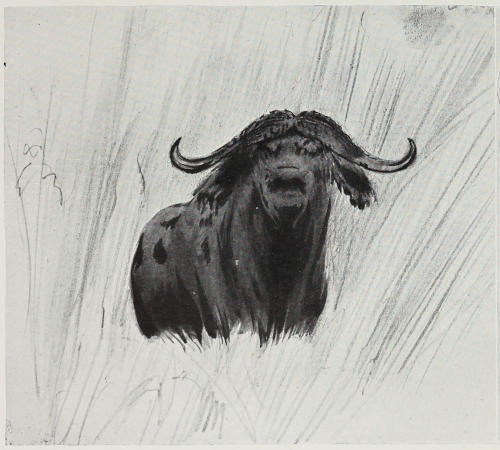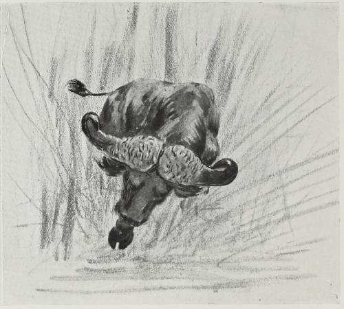 As with the semi-wild domesticated cattle of the ranching districts of America, the sight or smell of blood seems to infuriate buffalo more than anything. On one occasion when in want of meat I hit a cow buffalo in the lungs with a ·22 high-velocity bullet. She was one of a small herd, and as she staggered about in her death[173] agony all the others, including the calves and yearlings, went for her, goring her and knocking her about and completely hiding her from me. They were dreadfully excited, bellowing and roaring and even butting at one another.