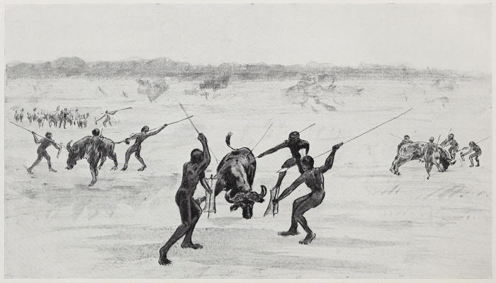 SOME RETREATING CLEVERLY BACKWARDS AND RECEIVING THE CHARGING ANIMALS’ RUSHES ON THEIR SHIELDS, WHILE OTHERS JABBED SPEARS INTO THEIR VITALS FROM THE SIDES.
