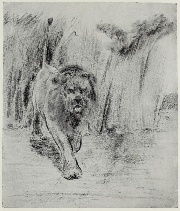 This hunting of lions by men who were novices at the game was attended by many casualties. I was told that in one year out of about forty visiting sportsmen who devoted themselves seriously to lion hunting, twenty were mauled. Of these twenty, more than half were killed or died from the effects of wounds. The lions of that period were extraordinarily bold and courageous. In the early morning on those huge plains I have walked steadily towards a troop of lions numbering a score. Just as steadily walked away the troop—no hurry or fear of man. When I ran, a magnificent male[177] deliberately turned and stood facing me. As I approached he advanced quietly towards me, while the others idled along in the opposite direction. One could hardly imagine a finer sight than this great bold fellow facing the rising sun on the dead open plain. But it was futile swagger on his part, for he was not a man-eater. He had killed and eaten to repletion like all the lions on those plains. And yet, there he was, deliberately advancing without cause or reason. This is the only instance in my experience of a lion, as it were, meeting one; more often they are off to cover, although when pursued and pressed they will sometimes turn.