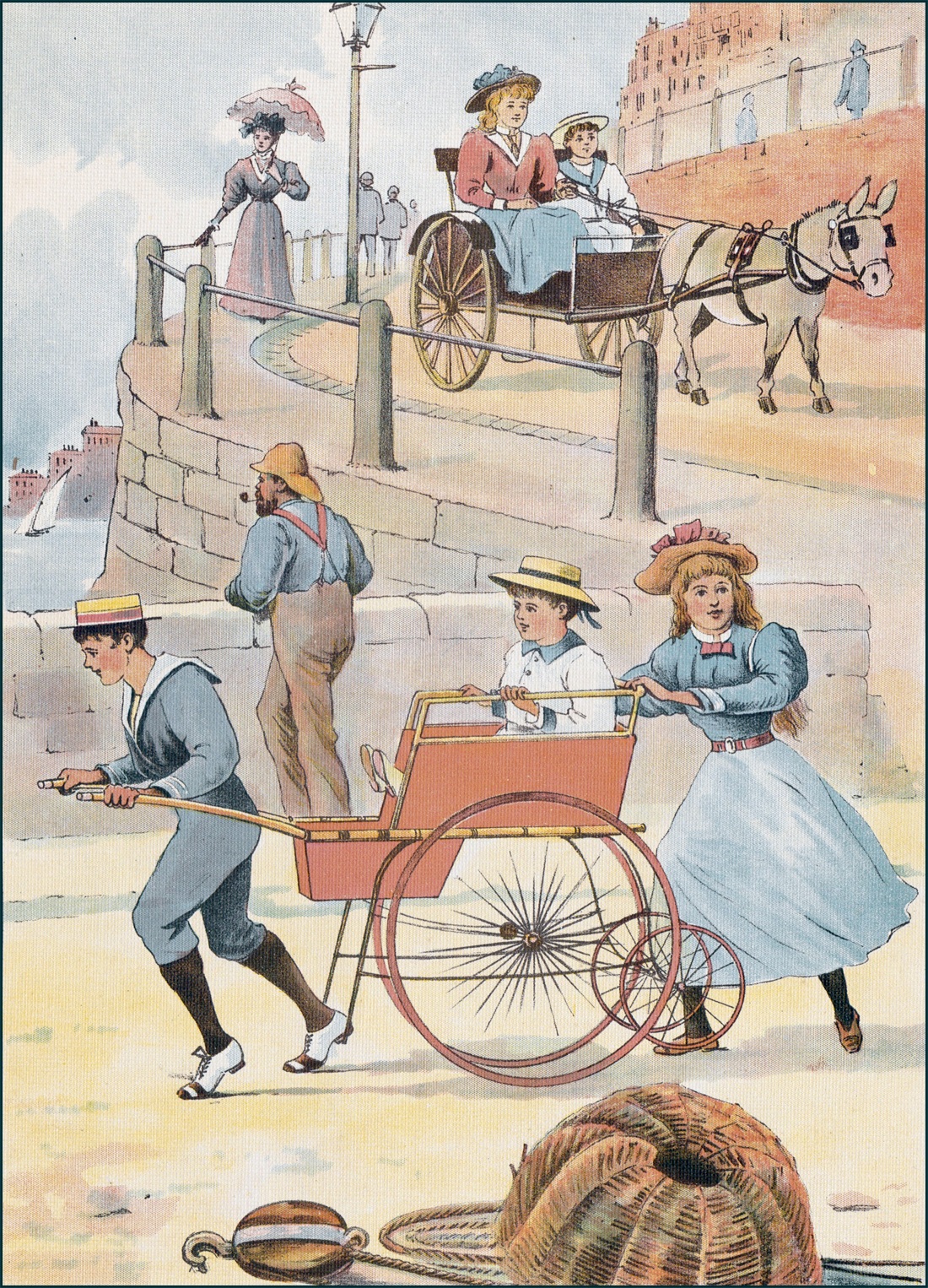Tour à tour aussi les aînés tiraient une charrette anglaise dans laquelle les plus jeunes prenaient place. Sans parler de tous les amusements de la plage; les châteaux de sable, la pêche aux crevettes, la récolte des coquillages etc.