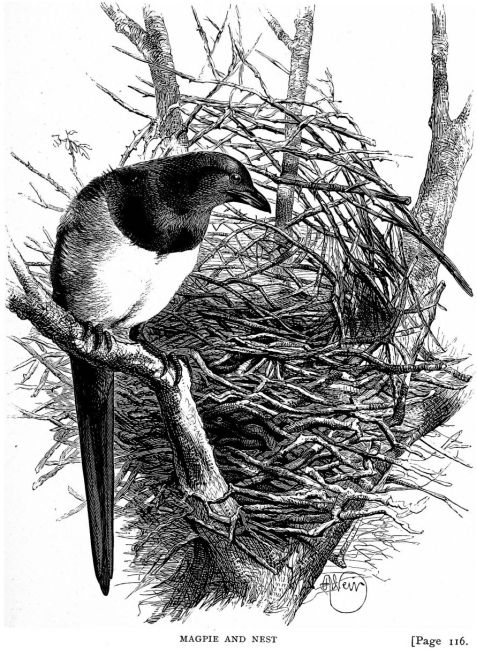 Like the rook, the magpie inhabits the same nest for several years, perhaps for the whole of his life, putting it into repair every year before he again needs it for family use—like a wealthy country family taking possession of their ancestral mansion in the spring.