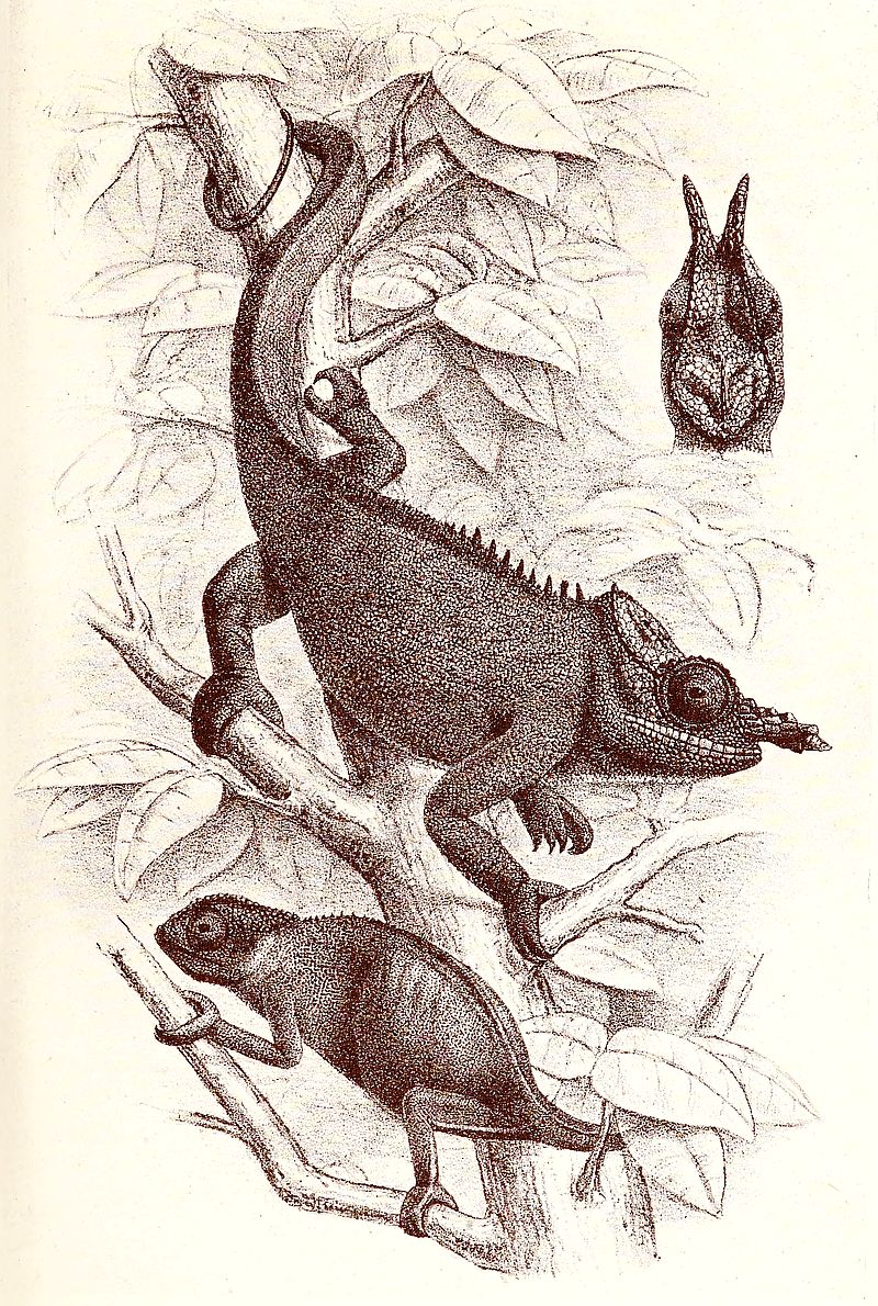 As we were walking about just before sunset, they brought us a chameleon, here called taròndro (Dicranosaura bifurca), about nine inches long and as much more in length of tail; it was dark brownish-grey in colour, with a white line along the sides, and the head and back serrated like a saw. The nose of the male has two compressed long horns covered with large scales. As we have already seen, Madagascar contains a considerable number of these reptiles, especially of species with remarkable processes on the head.