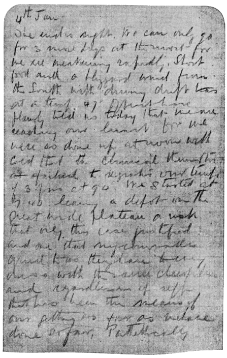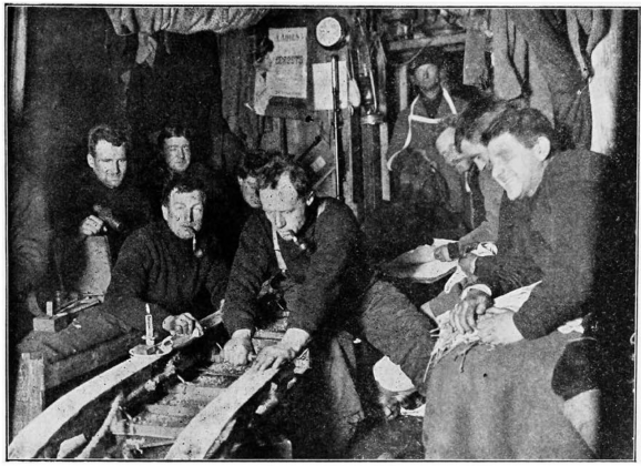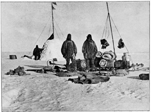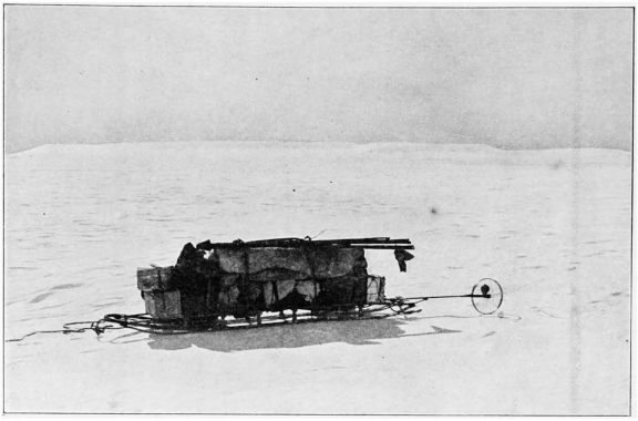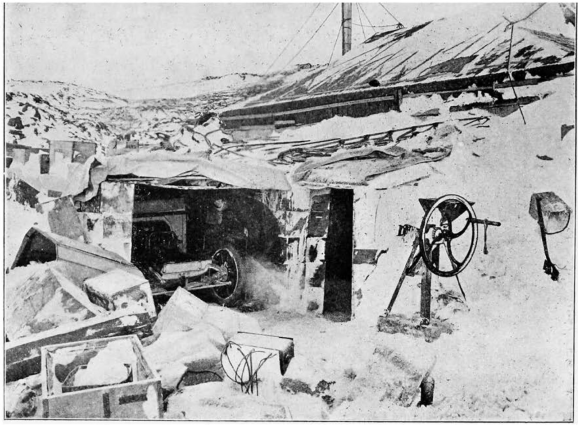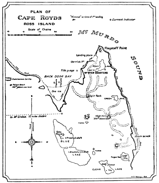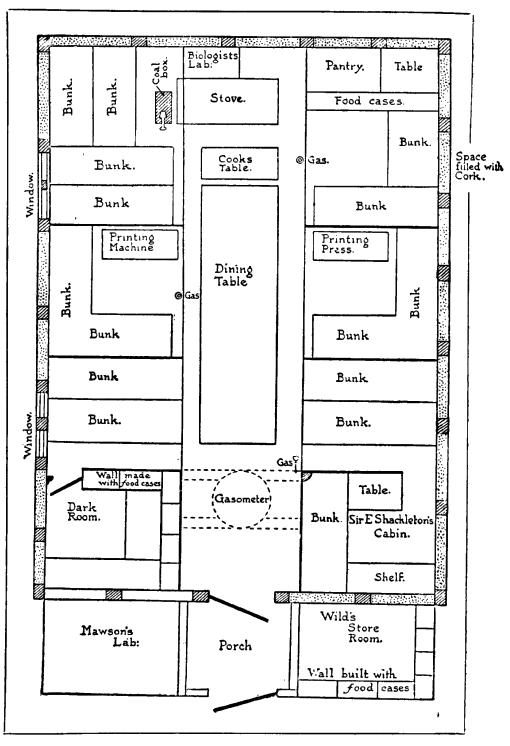 I left at the winter quarters on Cape Royds a supply of stores sufficient to last fifteen men for one year, for the changes and chances of life in the Antarctic are such that this supply might be most valuable to some future expedition. The hut was locked up and the key hung where it might easily be found, and we re-adjusted the lashing of our home so that it might withstand the fury of many blizzards. There our hut stands waiting to be used, and containing everything necessary to sustain life.
