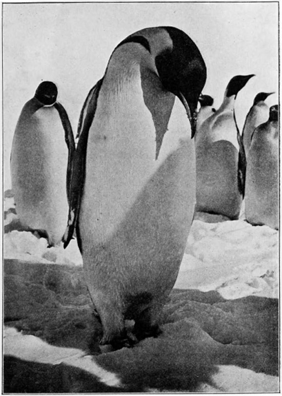 We saw the Emperor penguins only as a summer visitor, when having finished nesting and having fed up and become glossy and beautiful, they came up out of the sea, apparently to have a good time before moulting. While the Adelies were nesting the Emperors came in numbers to inspect the camp, the two kinds usually paying no attention to each other unless an Adelie thought an Emperor came too close to her nest, when an odd unequal quarrel followed. Little impudence, pecking and scolding, and being more than able to hold her own with the tongue, but knowing the value of discretion whenever the Emperor raised his flipper.