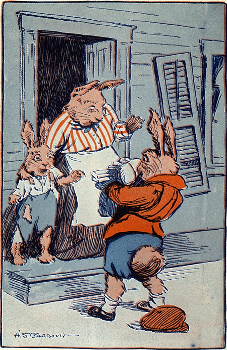 “Look out for Mr. Wicked Wolf,” said Lady Love, and then she gave the little bunny a lollypop and kissed him good-by, and after that away he hopped, and by and by, after a while, he came to a shabby little house near Rabbitville. So he knocked on the door and pretty soon it opened and there stood the little ragged rabbit’s mother.