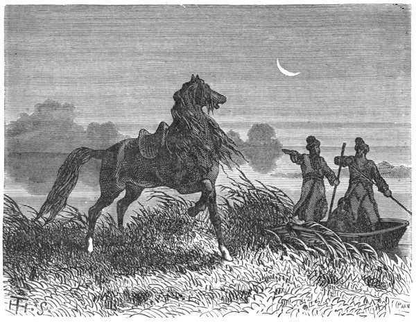Maroussia repartit; de fatigue il n’était plus question, son ami l’avait désiré; elle avait des ailes. Le champ de sarrasin est dépassé, voici le petit pont, elle y dépose ses deux couronnes. Un bruit sourd avait frappé son oreille. Elle écoute, le bruit se rapproche et se fait sonore. Ce doit être celui d’un cheval lancé au galop. Le cavalier est-il un ami ou un ennemi? Ce n’est pas un Cosaque. De loin on dirait un Tatare. Quand elle voyageait avec le vieux rapsode, ils évitaient toujours ces Tatares. Elle revient sur ses pas, repasse le pont. C’est égal, les couronnes y sont, c’est autant de fait. Maroussia est contente. Elle va se cacher dans les joncs. Le cavalier arrive à bride abattue; l’aurait-il aperçue? Elle espère que non. Mais à peine Maroussia avait-elle fait quelques pas à travers ces joncs qui poussaient au bord du ruisseau, qu’un coup de feu était parti. Le mouchoir rouge, ainsi que la jolie tête qu’il recouvrait, était tombé au milieu des roseaux. On eût dit une perdrix arrêtée dans son vol.