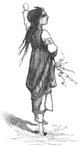Une vieille femme, coiffée d’un mouchoir brun d’où s’échappaient des flots de beaux cheveux gris, au visage froid et rigide, dans lequel deux grands yeux noirs étincelaient comme des étoiles, dit: