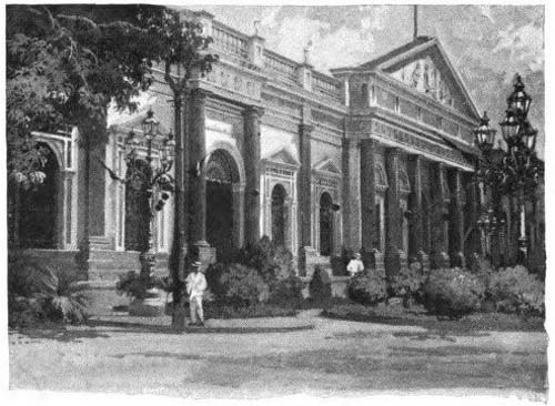 There are three great buildings in Caracas—the Federal Palace, the Opera-house, and the Pantheon, which was formerly a church, and which has been changed into a receiving-vault and a memorial for the great men of the country. Here, after three journeys, the bones of Bolivar now rest. The most interesting of these buildings is the Federal Palace. It is formed around a great square filled with flowers and fountains, and lit with swinging electric lights. It is the handsomest building in Caracas, and within its four sides are the chambers of the upper and lower branches of the legislature, the offices of the different departments of state, and the reception-hall of the president, in which is the National Portrait Gallery. The palace is light and unsubstantial-looking, like a canvas palace in a theatre, and suggests the casino at a French watering-place. It is painted in imitation of stone, and the statues are either of plaster-of-paris or of wood, painted white to represent marble. But the theatrical effect is in keeping with the colored walls and open fronts of the other buildings of the city, and is not out of place in this city of such dramatic incidents.