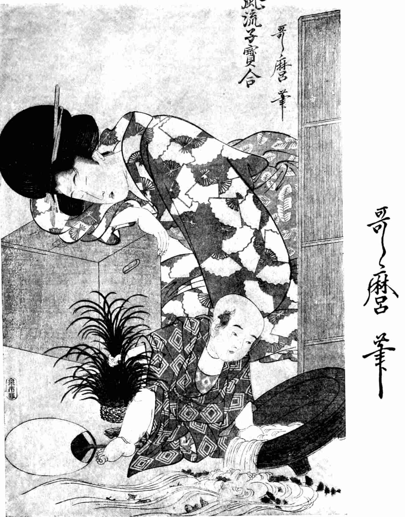 In the best prints the decoration of the dress fits in with the scheme of the picture. M. de Goncourt says: “If the figures are represented out of doors, flowers seem to be shed upon the dresses, as if the wearer passed beneath blossoming trees. If the artist paints butterflies on a costume, they harmonize with the background. If peonies are used he alternates their whiteness with a purple tint. And how admirable is their use of relief! Upon a blue or mauve gown, how charming is the white relief of an embossed cherry petal, and so marvellously executed is this goffering, that many of the oldest impressions retain the impression as perfectly as if only printed yesterday.” Utamaro at first equalled Kiyonaga in the majesty of his figures, later he lost beauty and strength in exaggeration. Yeishi shows a striking resemblance to Utamaro, and he, too, followed after Kiyonaga: his studies of women are noted for their refined elegance. Yeisen compares with Utamaro in the grace with which he portrays women, and Yeizan’s lines are stronger, but show a marked similarity. Hartmann says: “The linear beauties of the representations of Yeizan, Yeishi, Yeisen, impress one like a Nautch, like some languid oriental dance in which the bodies undulate with an almost imperceptible vibration. The Japanese see in a woman, a glorification of all beautiful things—they even study the natural grace of the willow, plum and cherry trees, to find the correct expression of her movements.”
