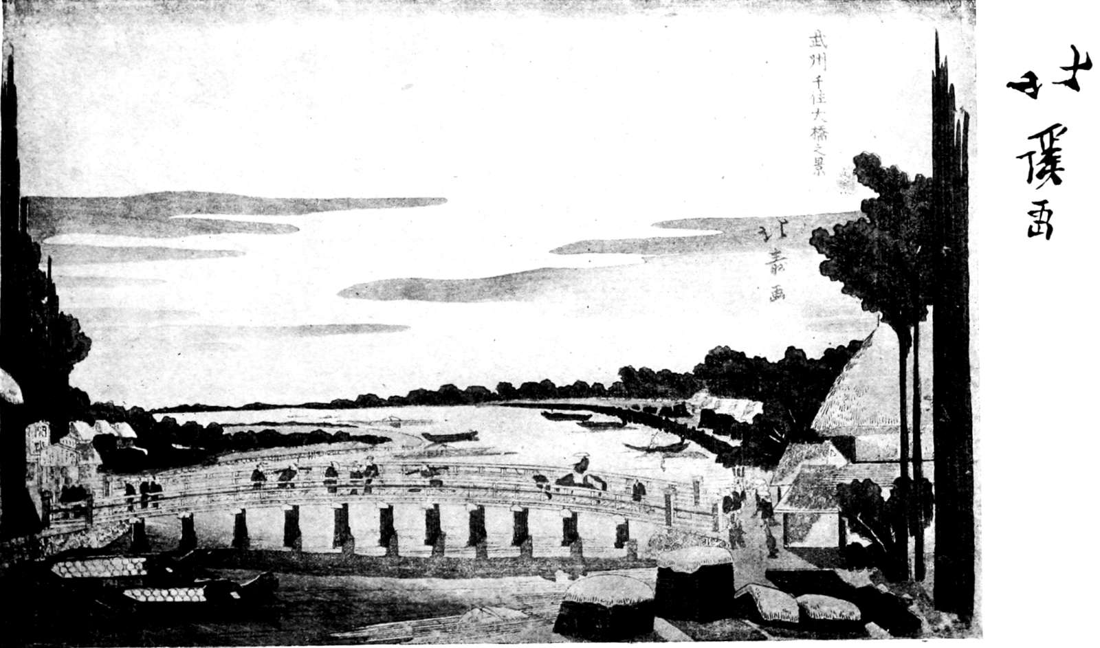 The landscape of Hiroshige, though confined to the narrow range of the wood-cut, have all the qualities of Impressionism, the details are subordinated, only the salient points of the scene being represented, but the atmosphere supplies what is lacking, and this incommunicable, subtle gift, the birthright of the artists, enabled them to conjure living pictures from the hard medium of the wooden block.