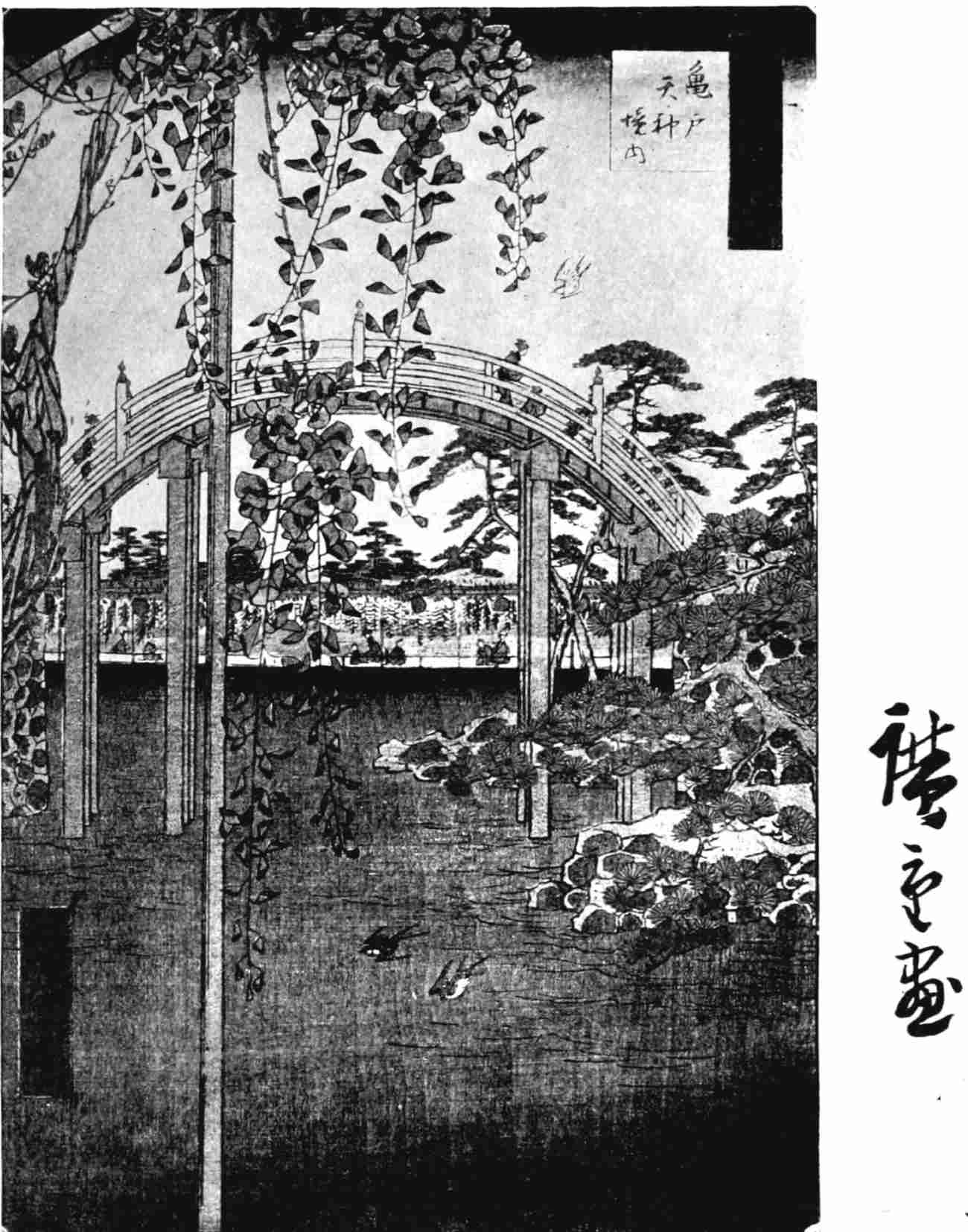 Leaning upon the bridge, the sweet influence of Hiroshige permeating his soul, in the crucible of his fancy he blent with the radiant Orient a vision of old London, grimy and age-worn, and realized “a Japanese fancy on the banks of the gray Thames.” To this picture he set the seal of his brother artist, and so the two apostles of Impressionism, Occidental and Oriental, in that loveliest nocturne, will together go down to posterity.