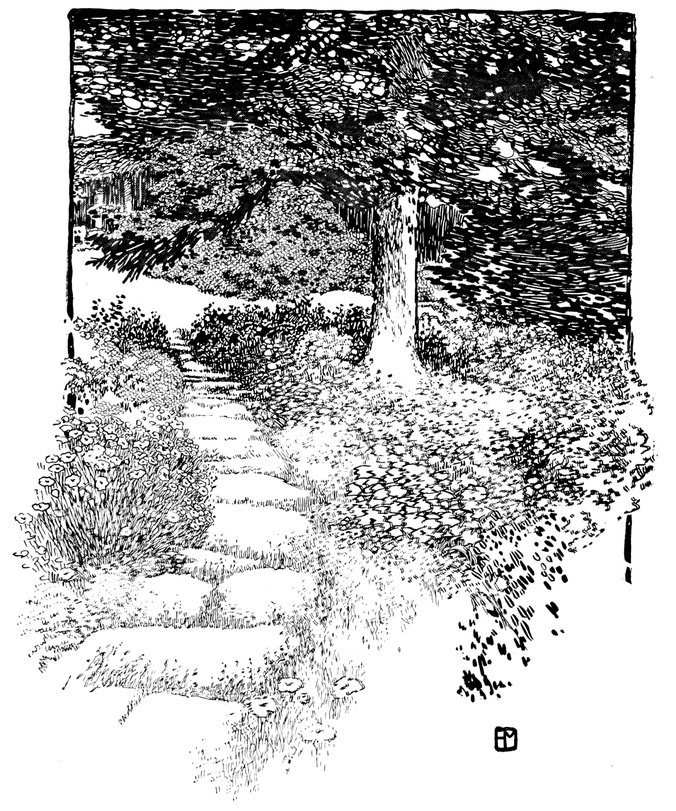 A collection of flowers, no matter how beautiful they may be, does not make a garden, any more than the colors on a painter’s palette make in themselves a picture. A real garden is just as artificial as a painting, and yet it has not the advantage of artificial surroundings. The landscape architect must put his composition down in the open air with the sky and the trees and the grass as a background, and must juggle with nature in order that his composition may not look out of place, keeping always in his mind the balance between masses of color and offsetting masses of green. It is perhaps for this reason that we unconsciously 5feel that a garden is best shut in, at any rate, in part, from the surrounding lines of the landscape. This enclosure does not necessarily mean a wall, nor does it mean that a garden should have no outlook, but only that there should be some definite limit.