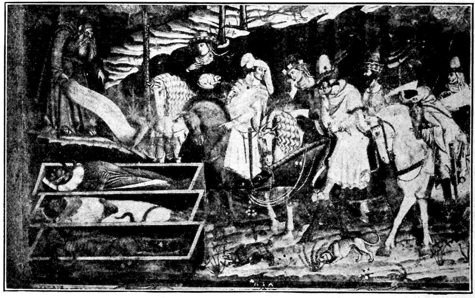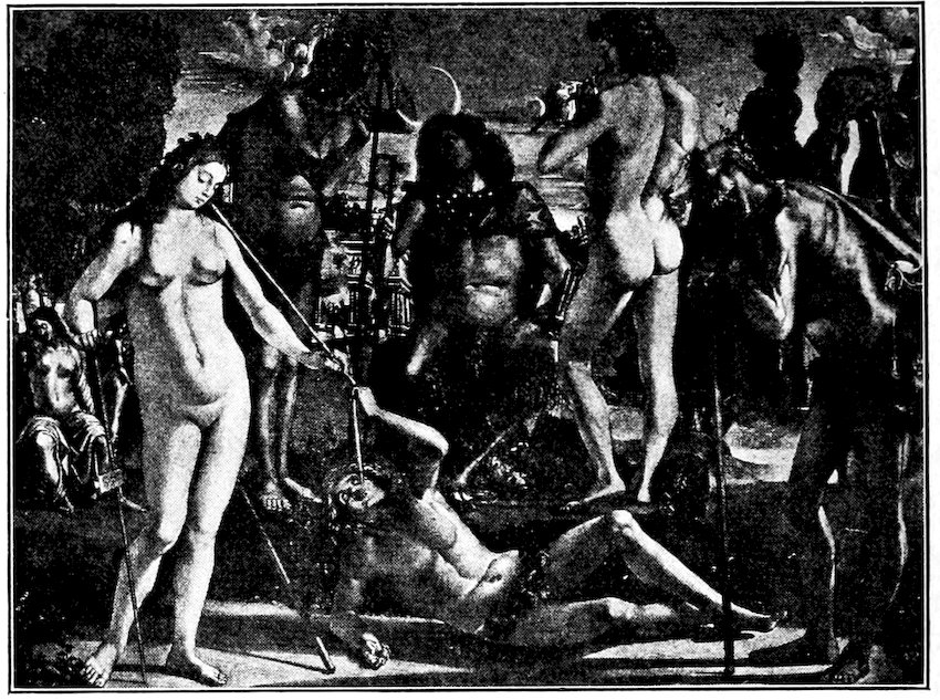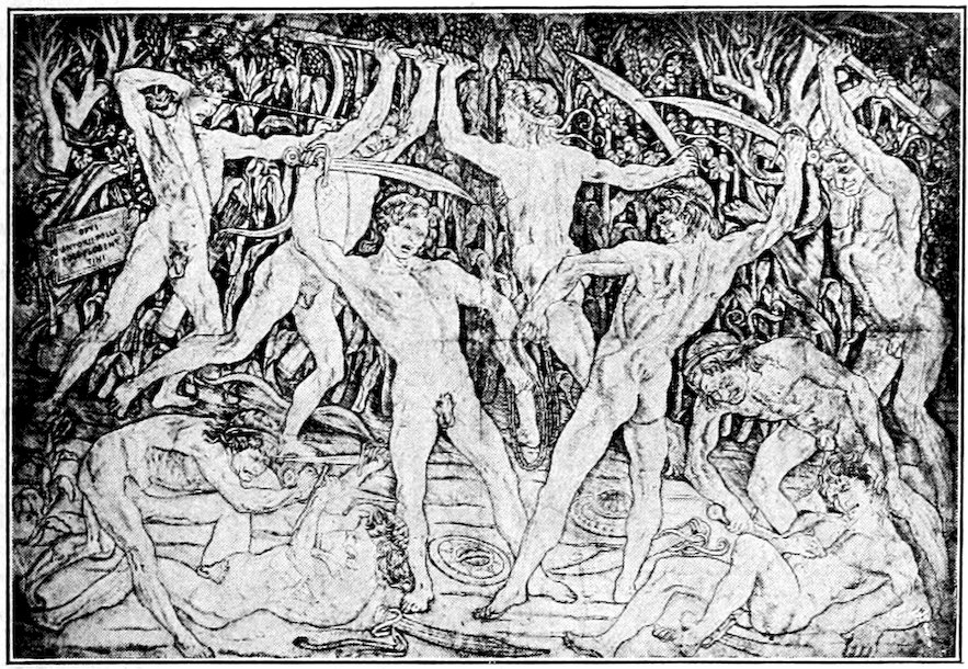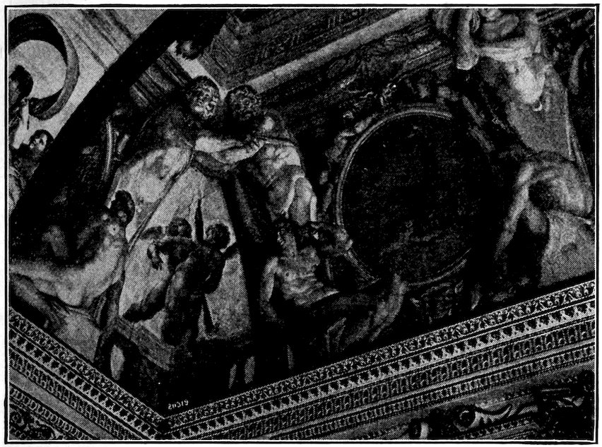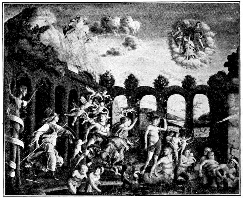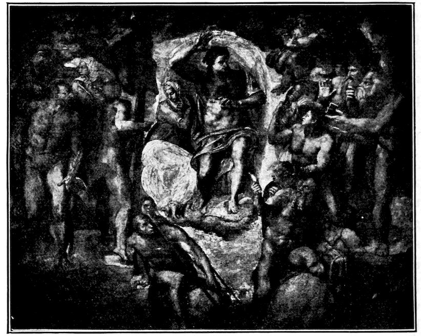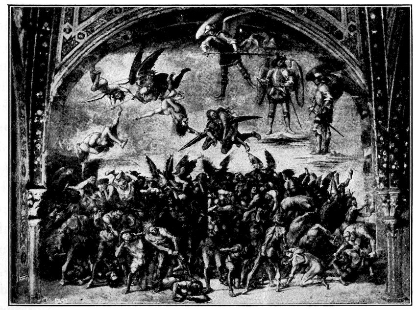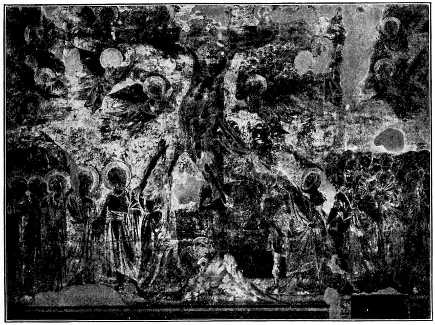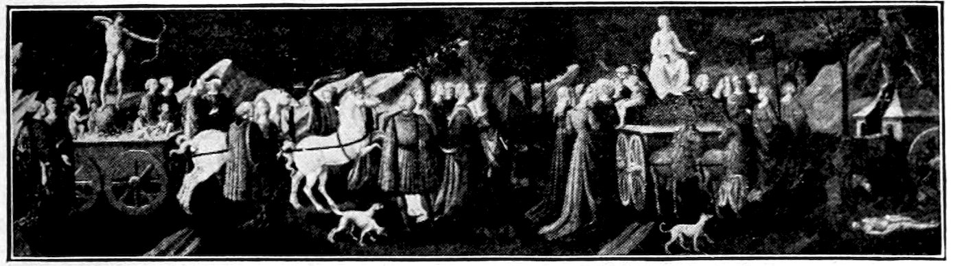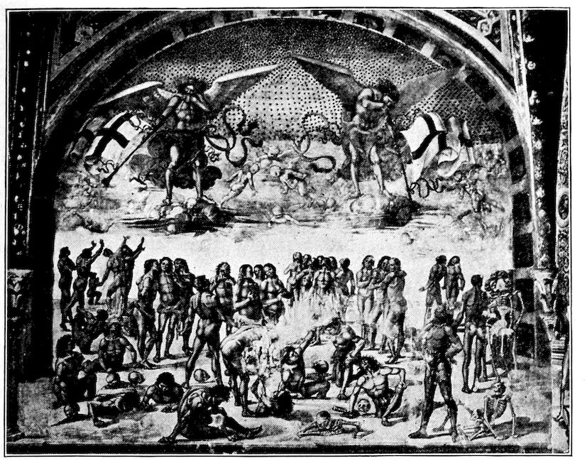 A later contemporary of Giotto’s, Buonamico Buffalmacco,[13] seems to have inherited something of Giotto’s power, but the identification of his work is very uncertain, and he lives for us chiefly as an egregious wag in the pages of the Italian story writers.