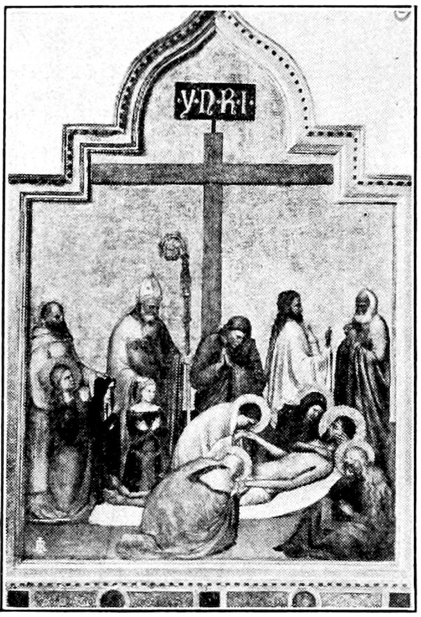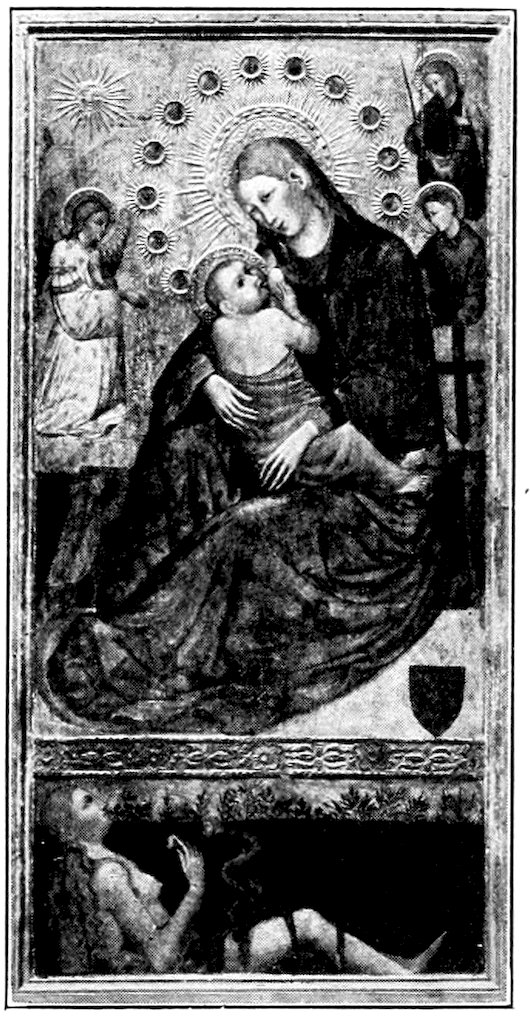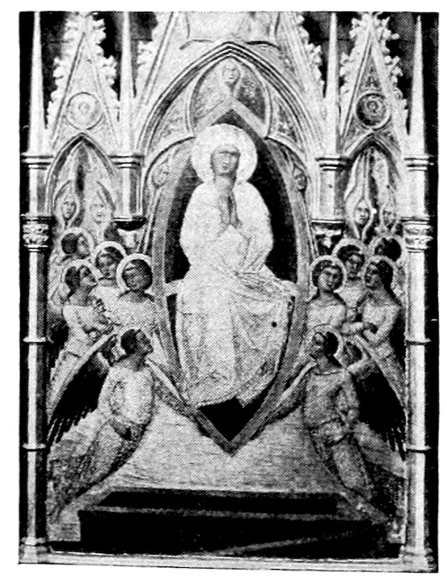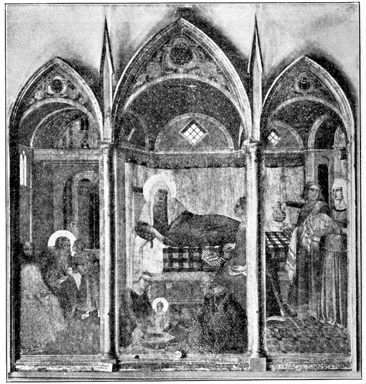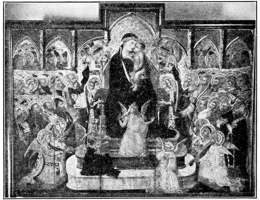 From another contemporary and possibly a scholar of Giotto, Bernardo Daddi, we have many panel pictures and a few frescoes at Santa Croce. He is an admirable craftsman, and a sincere illustrator, within his limitations, applying very competently to panel painting something of the panoramic realism of Ambrogio Lorenzetti. A prolific artist, his exquisitely finished little panels are quite common. In America are good examples in the New York Historical Society, in the Platt Collection, Englewood, and a more monumental piece in the Johnson Collection, Philadelphia. He lived well beyond the middle of the century.