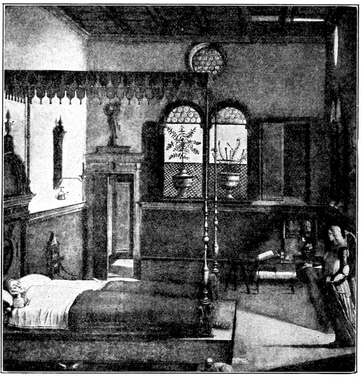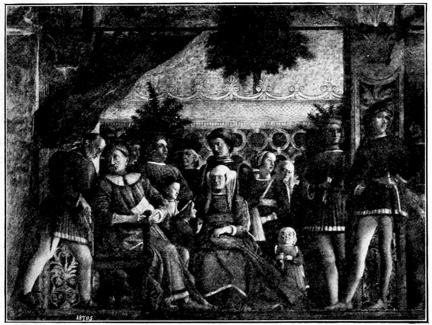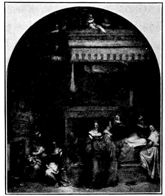 So much for the shop methods. Now for him who makes shops possible—the patron. A wealthy Florentine as naturally wanted to invest in a frescoed chapel as a wealthy American 7does in a fleet of motor cars. Considering the changed value of money, one indulgence was about as costly as the other. But the Florentine never quite regarded paintings as luxuries. They were necessary to him. He loved them. They enhanced his prestige in this world and improved his chances in the next. Then to beautify a church was really to magnify the liberty and prosperity of Florence, which largely derived from the Holy See. Recall that every Florentine was born a Catholic, baptized in the fair Church of St. John with the name of a saint. This saint, he believed, could aid him morally and materially, was in every sense his celestial patron. It paid to do the saint honor, and that could best be done through the painter’s art. The poorest man might have a small portrait of his patron, a rich man might endow a chapel and cause all his patron’s miracles to be pictured on the wall. Think also that every altar—a dozen or more in every large church—was a shrine[1], containing the bread and wine that by the never-ceasing miracle of the Mass became the Saviour’s body and blood; and was also a reliquary or tomb, containing in whole or part the body of some saint. Every altar then, and every chapel inclosing one, cried out for a twofold interpretation of its meaning. Everything about the Eucharist had to be explained (involving pretty nearly all of Biblical history), and the particular relic required similar illumination. Since many of the faithful could not read, and the Catholic Church has ever been merciful as regards sermonizing, these explanations of the altar as miracle shrine of Our Lord and as tomb of a particular saint were best made pictorially, and generally were so made.